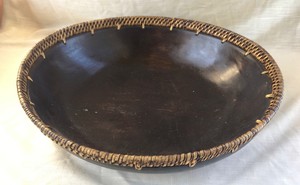 Large Carved Dark Wood Bowl With Rattan Basket Weave Edge Bali