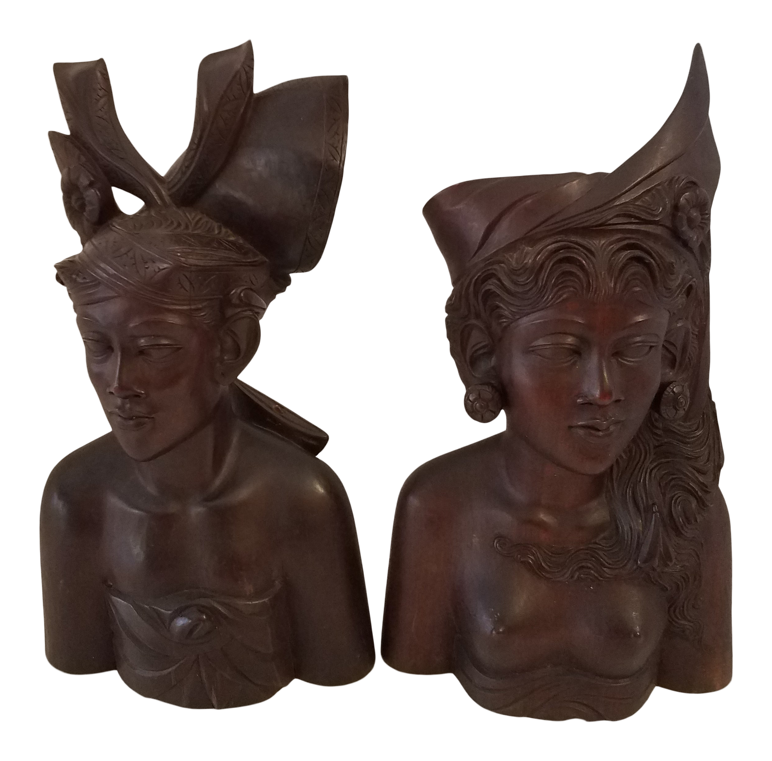 Vintage Bali Wood Carved Bust Sculptures Man Woman Wedding