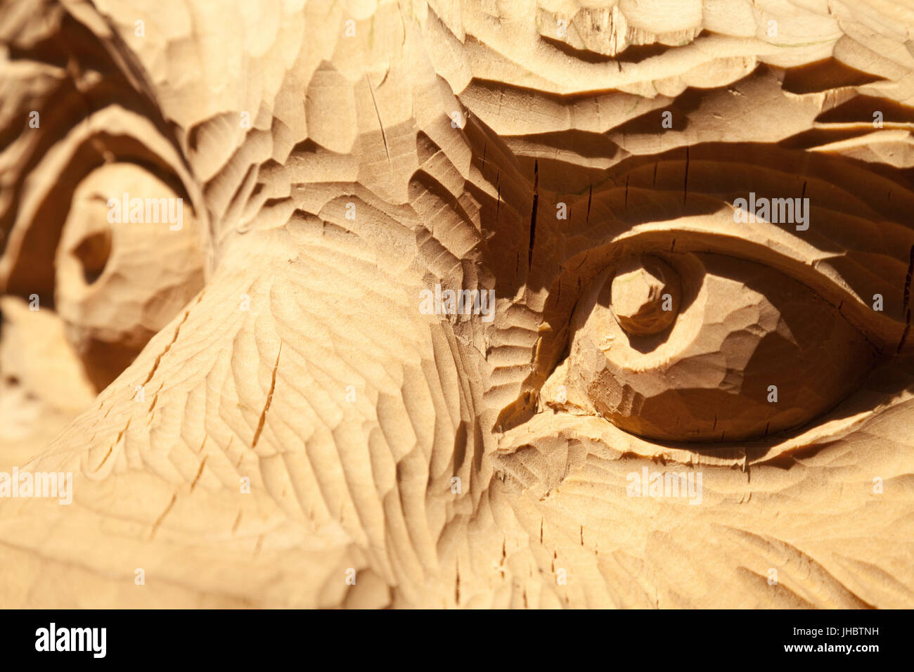 Wild Animal Eyes Carved In Wood Looking Aside Close Up Tiger