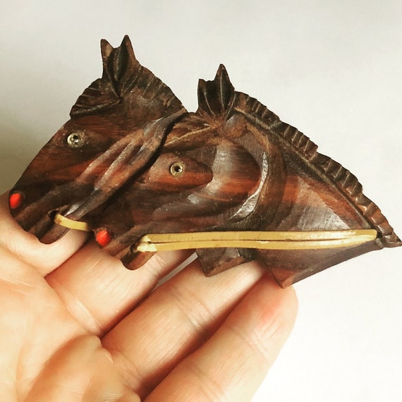 Vintage 1940s Carved Wood Double Horse Head Brooch With Glass Etsy
