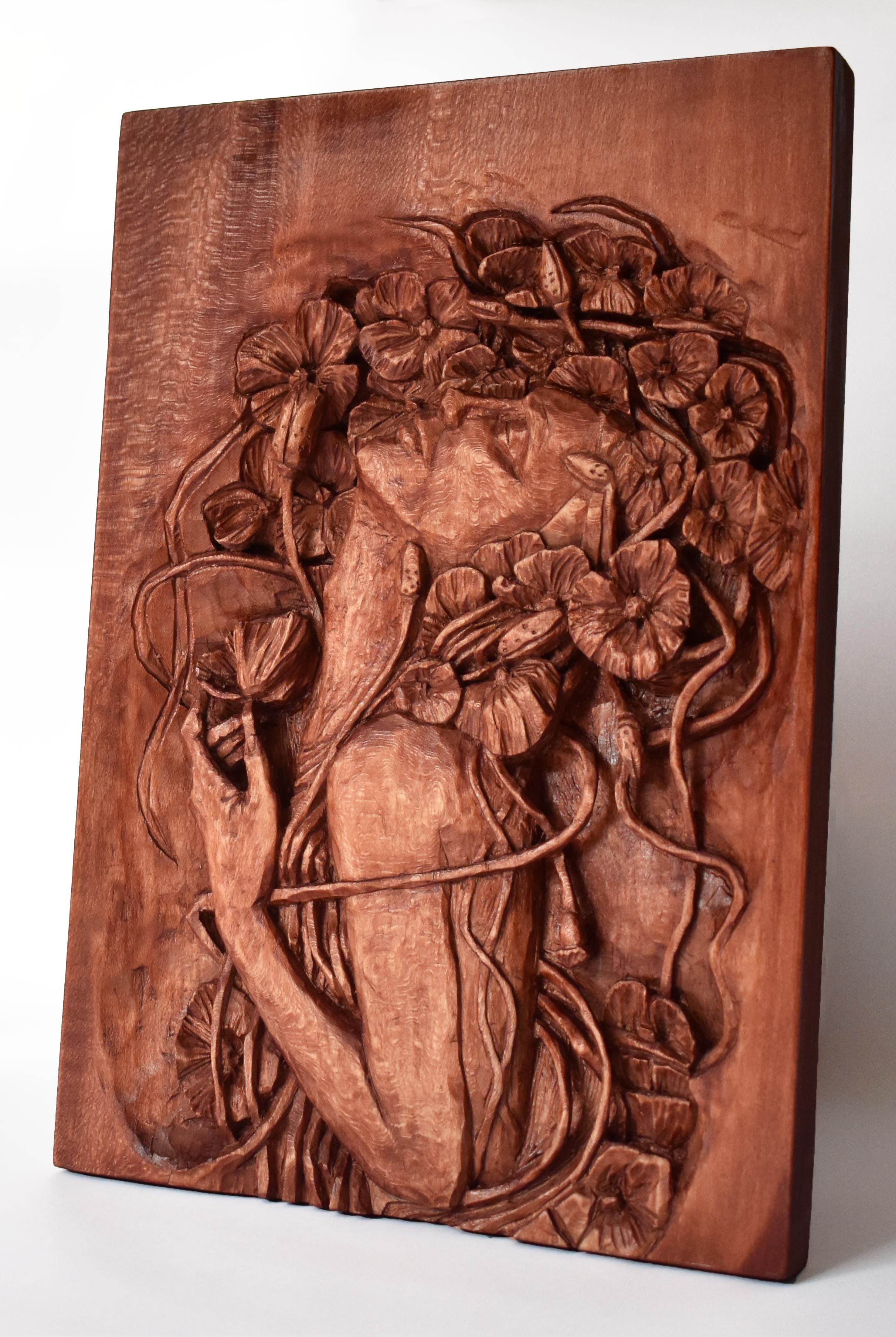 Nixie Wood Relief Handmade Carving Basswood Sculpture Mahogany Wine