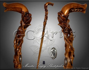 Fantasy Daragon Cane Dark Wooden Walking Stick Hand Carved Etsy
