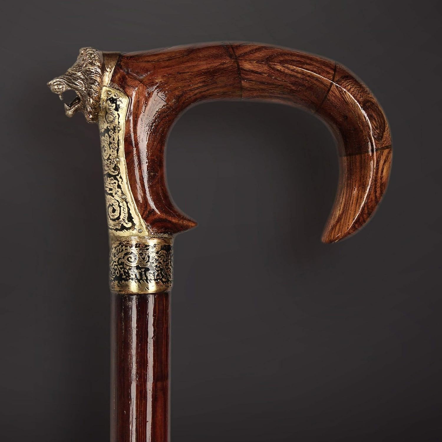 Gc Artis Lion Head Wood Carved Walking Stick Ergonomic Palm Grip